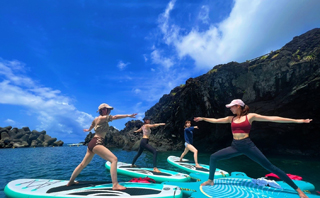八丈島の大自然をバックに青い海の上でSUPYOGAスクールを開催しております